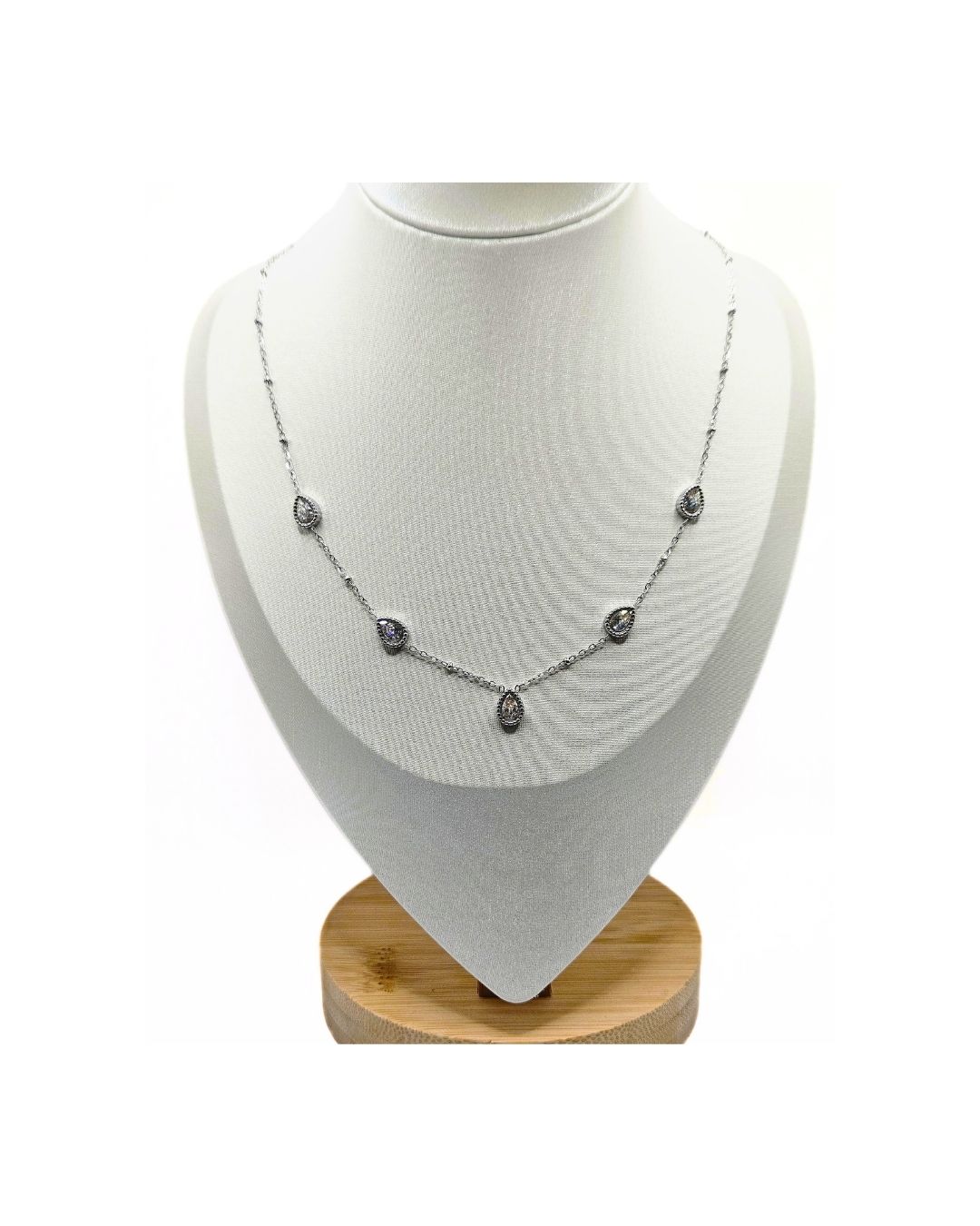 Ένα εκλεπτυσμένο κολιέ από ανοξείδωτο ατσάλι σε ασημένια απόχρωση, με λεπτή αλυσίδα και διακριτικά δάκρυα που χαρίζουν κίνηση και φως σε κάθε εμφάνιση.