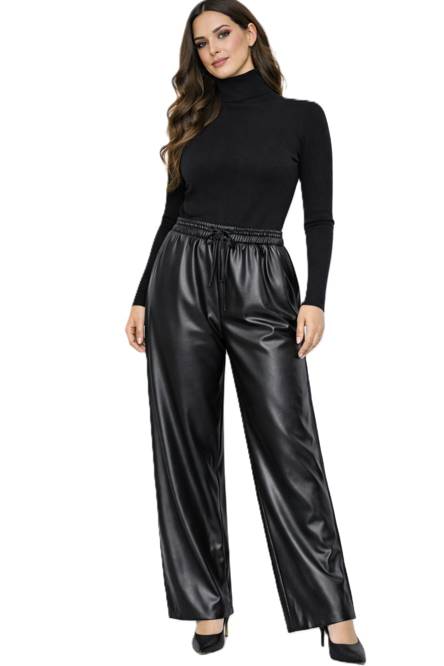 Η ίσια, φαρδιά γραμμή χαρίζει αέρινη κίνηση και άνεση σε κάθε βήμα, ενώ η υφή δερματίνης προσθέτει fashion χαρακτήρα χωρίς να βαραίνει το σώμα. Ένα κομμάτι που μεταμορφώνεται εύκολα ανάλογα με το styling, προσφέροντας κομψότητα χωρίς προσπάθεια.