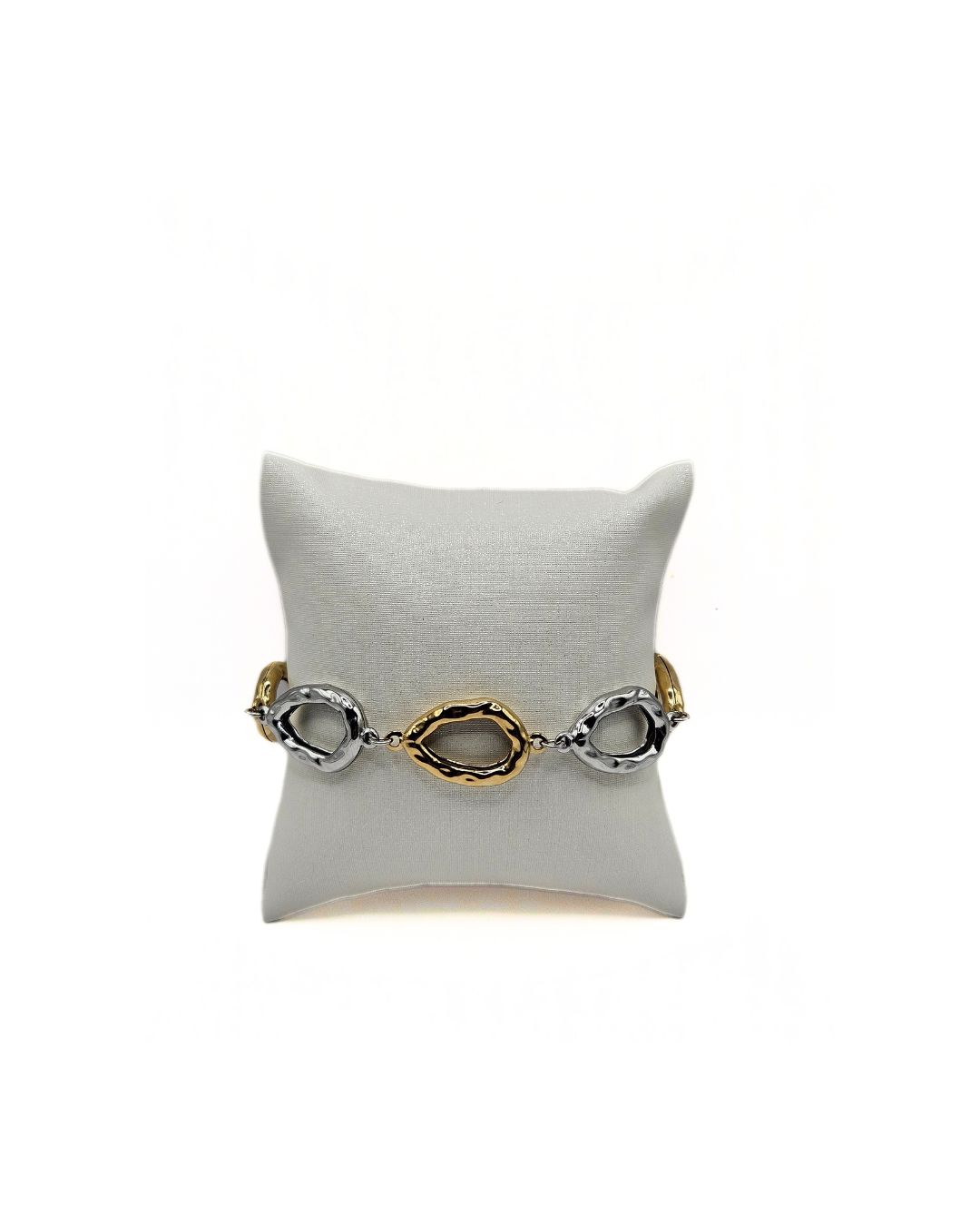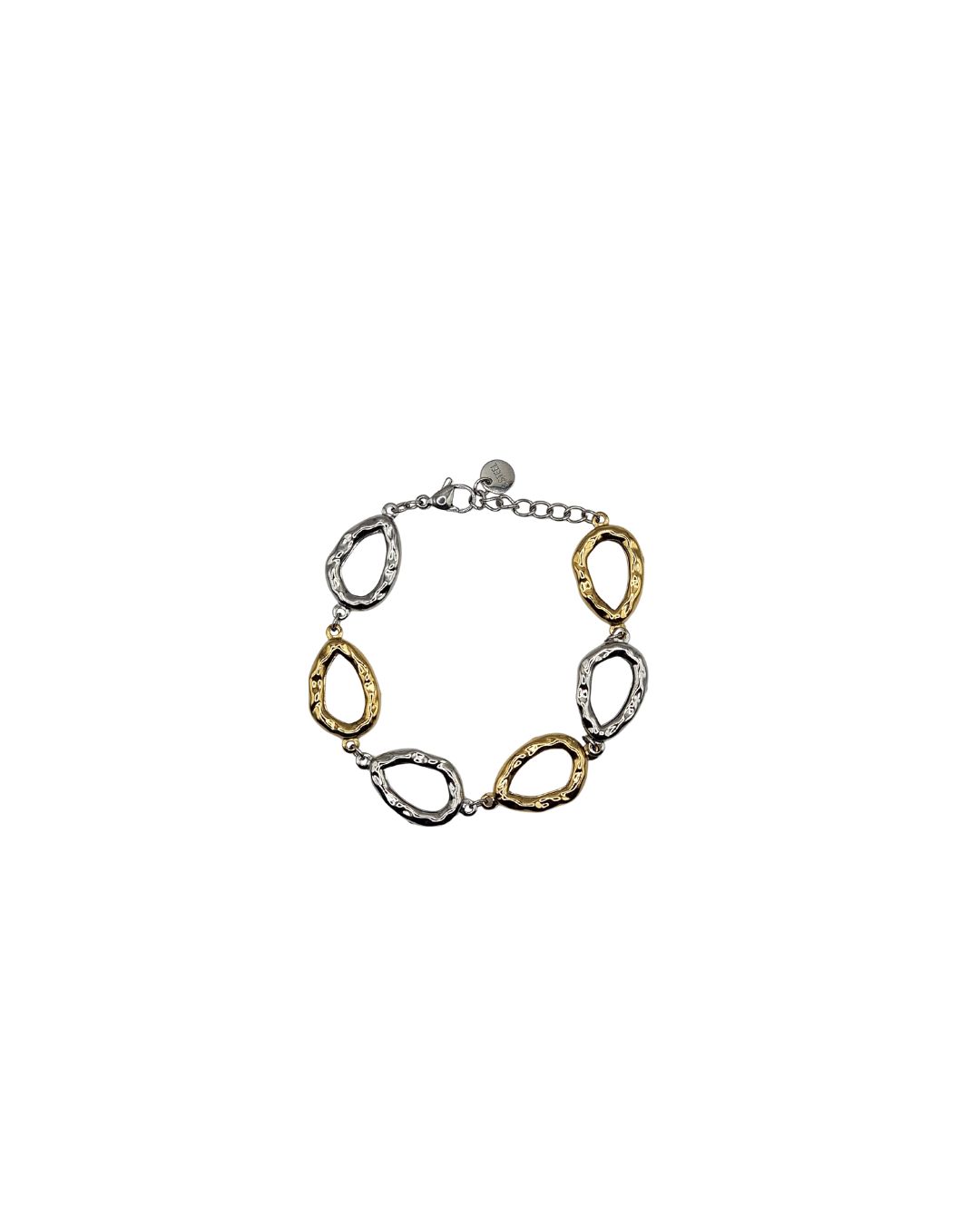 Το δίχρωμο βραχιόλι με οβάλ στοιχεία συνδυάζει κομψότητα και μοντέρνα αισθητική, δημιουργώντας ένα κόσμημα που ξεχωρίζει. Τα οβάλ στοιχεία χαρίζουν ρευστότητα και δυναμισμό στο design, ενώ η δίχρωμη απόχρωση σε χρυσό και ασημί το καθιστά εύκολο να ταιριάζει με κάθε outfit και αξεσουάρ.