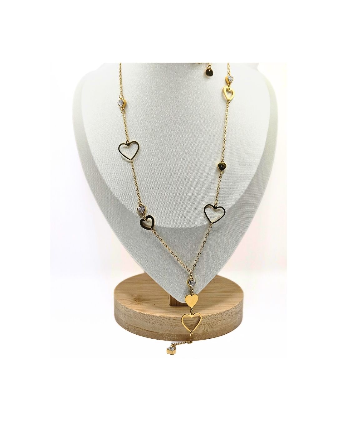 Πολύ μακρύ χρυσό κολιέ στολισμένο με μεγάλες και μικρές καρδιές, όπου οι μικρότερες λάμπουν με διακριτικά στρας. Ένα κομψό και εντυπωσιακό κόσμημα που προσθέτει ρομαντική λάμψη σε κάθε εμφάνιση.