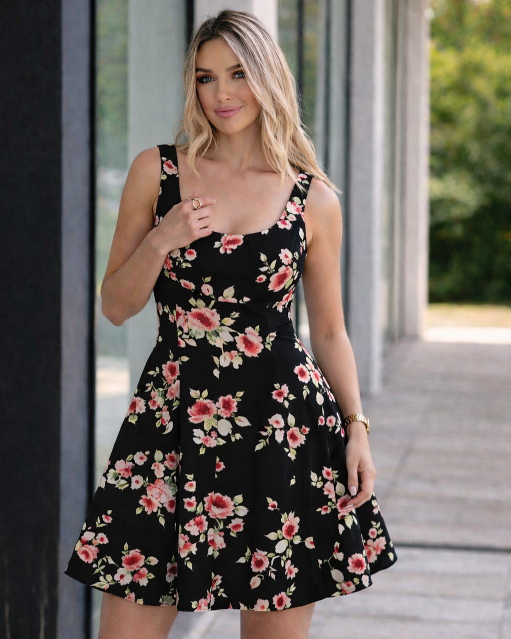 Mini φόρεμα με floral σχέδιο και τιράντες, ιδανικό για ρομαντικές καλοκαιρινές εμφανίσεις.