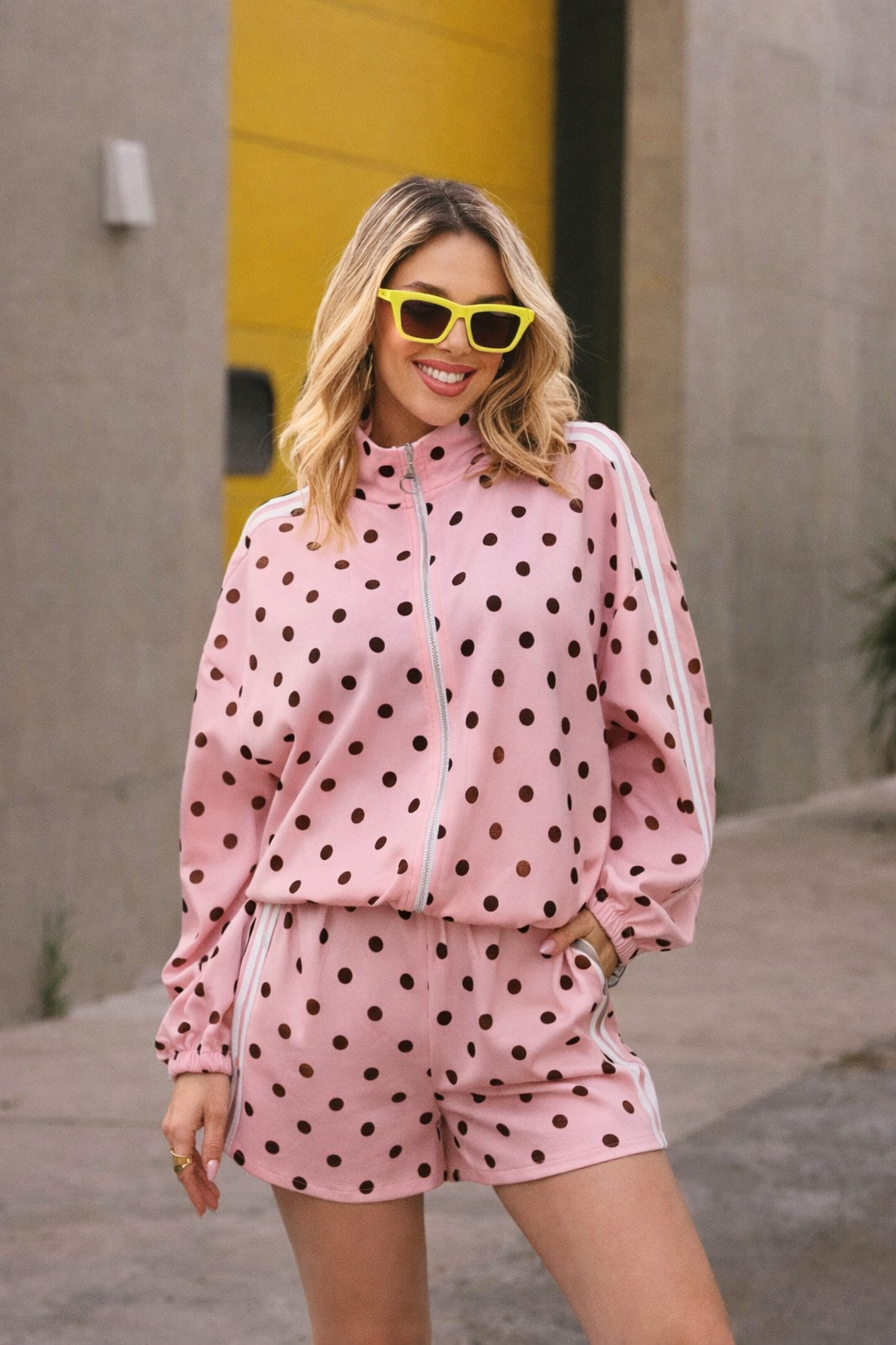 Μοντέρνο και άνετο γυναικείο σετ με παιχνιδιάρικο polka dot σχέδιο που δίνει φρέσκια και νεανική διάθεση σε κάθε εμφάνιση. Ο συνδυασμός της ζακέτας με φερμουάρ και του σορτς δημιουργεί ένα ολοκληρωμένο sporty-chic outfit ιδανικό για τις ανοιξιάτικες και καλοκαιρινές ημέρες.