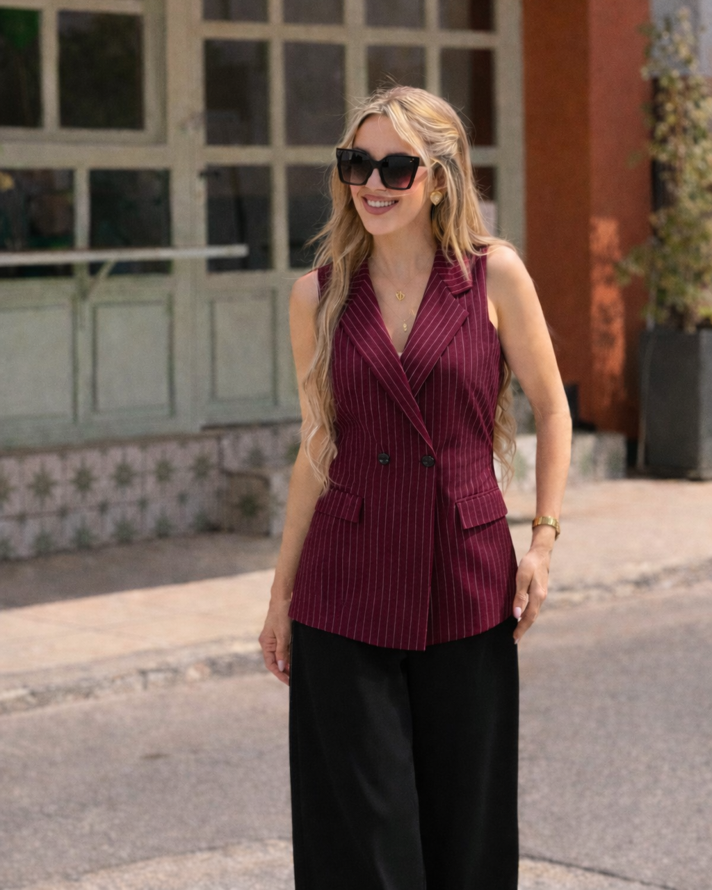 Κομψό γιλέκο σε γραμμή σακακιού με σταυρωτό κούμπωμα και λεπτή λευκή ρίγα που αναδεικνύει τη σιλουέτα και χαρίζει διαχρονικό χαρακτήρα. Η tailored εφαρμογή δημιουργεί ένα προσεγμένο και elegant αποτέλεσμα, ενώ το αμάνικο κόψιμο το καθιστά ιδανικό για layering σε κάθε εποχή. Φοριέται εύκολα από το πρωί στο γραφείο έως τη βραδινή έξοδο, προσθέτοντας στυλ και δυναμισμό σε κάθε σύνολο. Συνδυάζεται άψογα με παντελόνια, φούστες ή δερματίνη για πιο fashion εμφανίσεις.