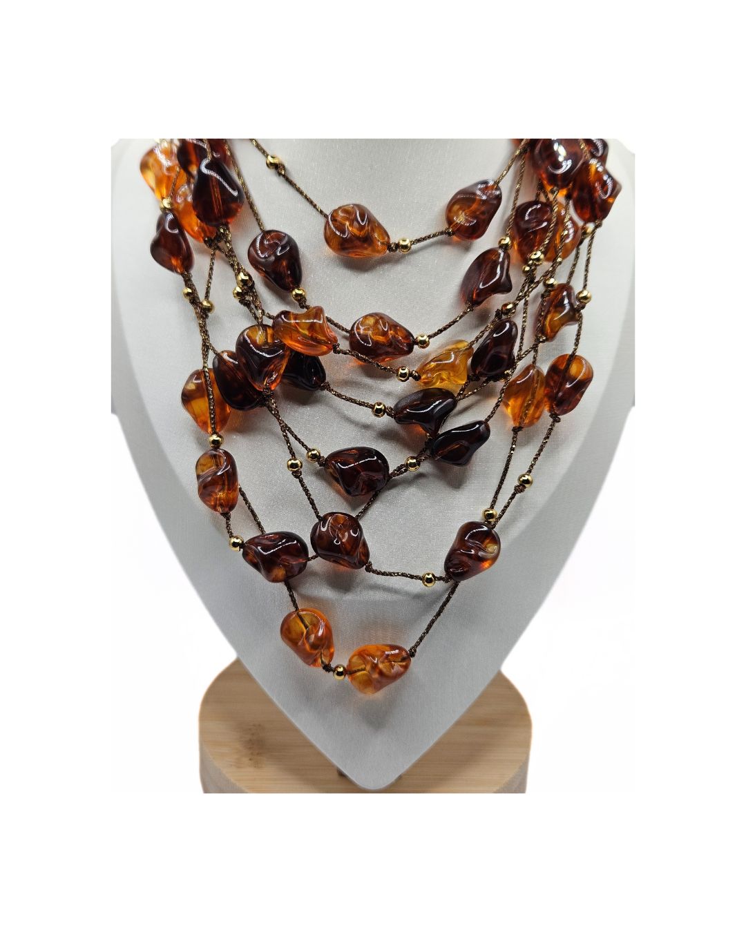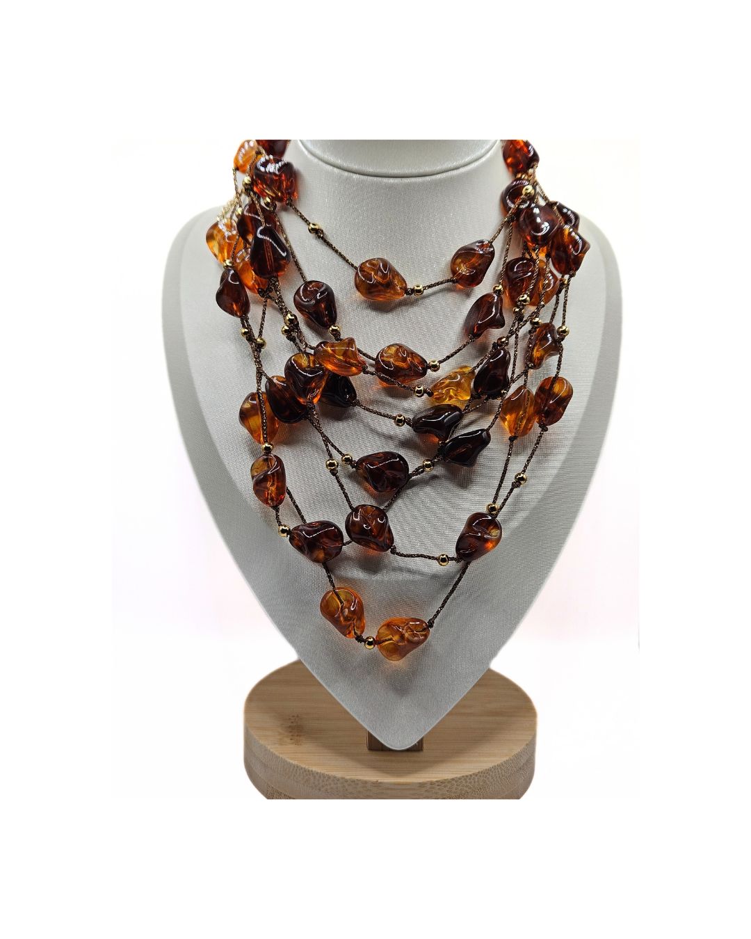 Οι καφέ πέτρες προσθέτουν ζεστασιά και γήινη αισθητική, ενώ η μοναδική σχεδίαση το καθιστά ιδανικό να φορεθεί μόνο του, χωρίς να χρειάζεται συνδυασμό με άλλα κολιέ. Το μήκος των κορδονιών δημιουργεί κίνηση και ένταση, προσφέροντας ένα διαχρονικό και εντυπωσιακό look.