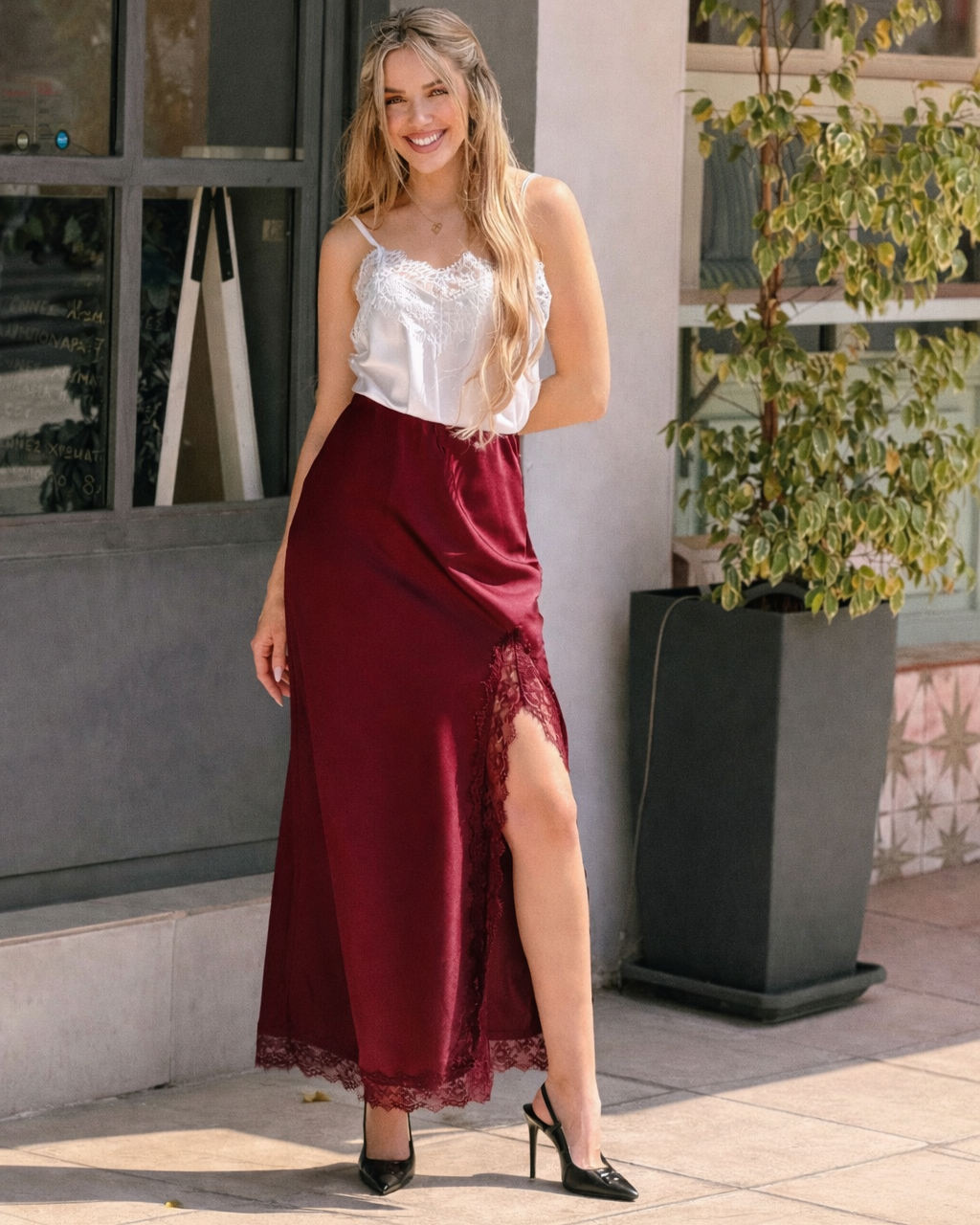 Θηλυκή lingerie φούστα που αναδεικνύει κομψά τη σιλουέτα και χαρίζει αισθησιακή κίνηση σε κάθε βήμα. Η ψηλόμεση εφαρμογή αγκαλιάζει όμορφα τη μέση, ενώ το εντυπωσιακό πλαϊνό σκίσιμο με λεπτομέρεια δαντέλας προσθέτει μία διακριτικά σαγηνευτική πινελιά. Το σατινέ ύφος του υφάσματος πέφτει απαλά στο σώμα, δημιουργώντας elegant αποτέλεσμα με αίσθηση πολυτέλειας.