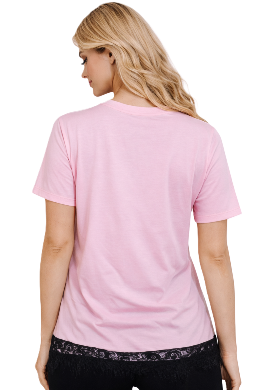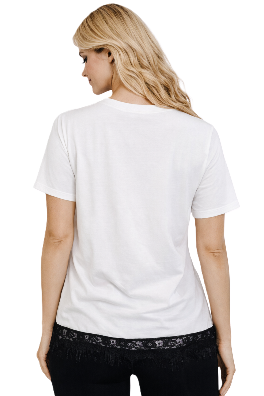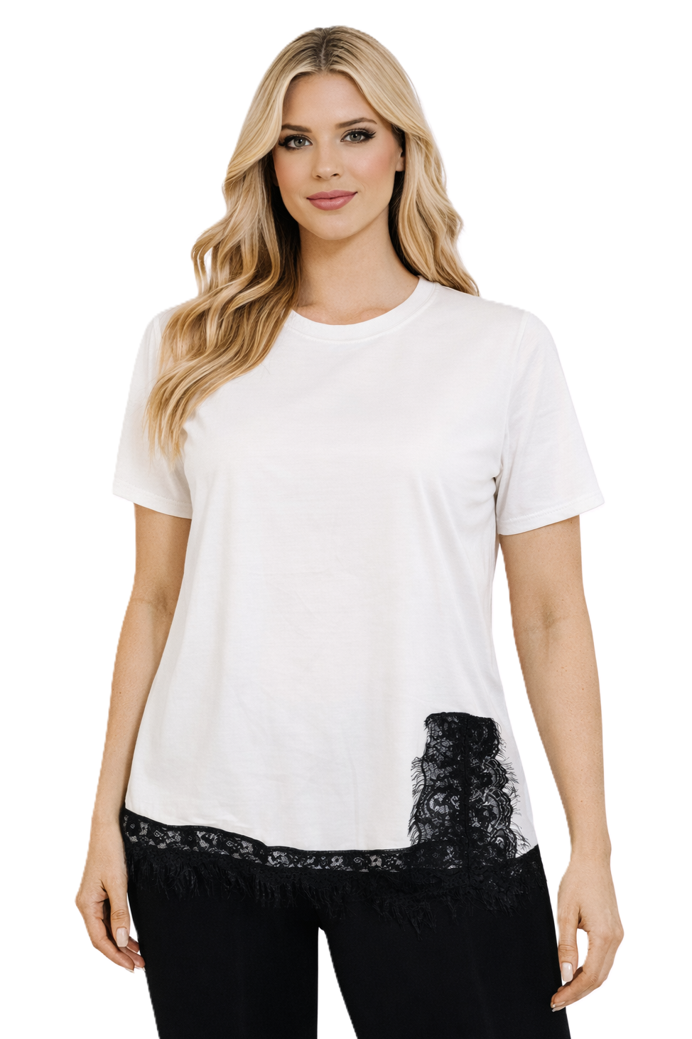 Κοντομάνικη μπλούζα με κομψό και θηλυκό σχεδιασμό που ξεχωρίζει χάρη στο εντυπωσιακό τελείωμα από δαντέλα στο κάτω μέρος. Η απαλή γραμμή της αγκαλιάζει όμορφα το σώμα χωρίς να πιέζει, ενώ η μαύρη δαντέλα δημιουργεί μια elegant αντίθεση που αναβαθμίζει το σύνολο.