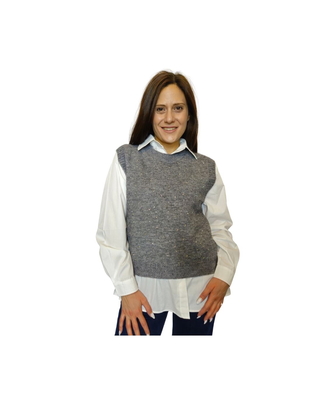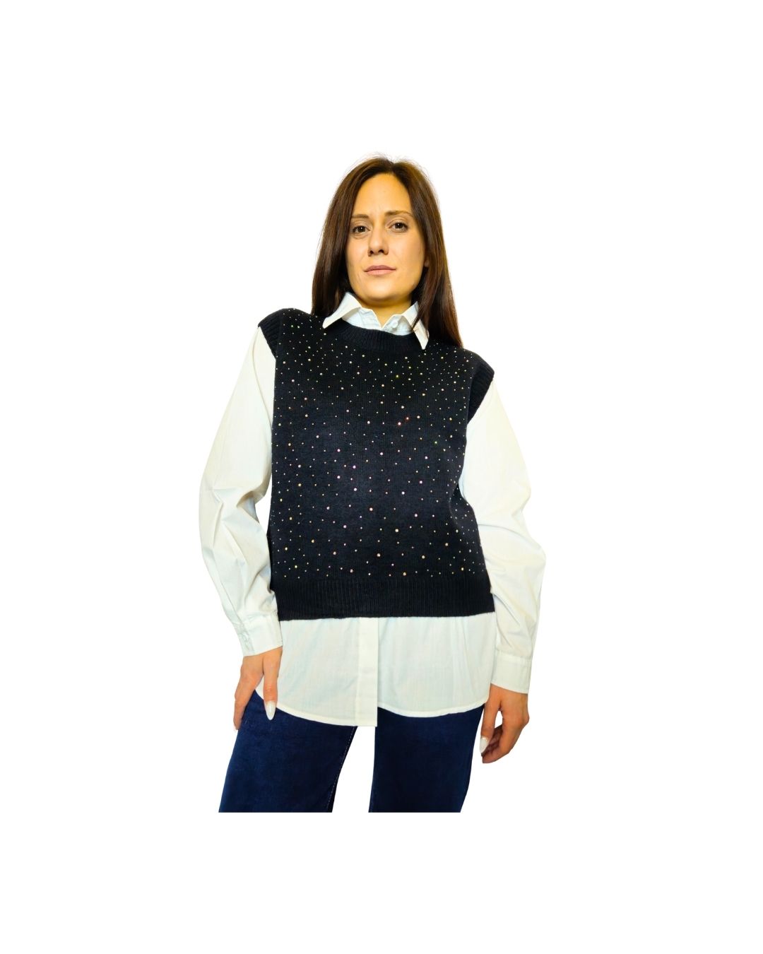 Δώσε λάμψη και στυλ στις εμφανίσεις σου με αυτό το εντυπωσιακό σετ πλεκτού γιλέκου με στρας και πουκάμισου. Το γιλέκο είναι διακοσμημένο με λαμπερά στρας που προσθέτουν glam χαρακτήρα, ενώ το πουκάμισο χαρίζει κλασική κομψότητα και ισορροπεί τέλεια το look.
