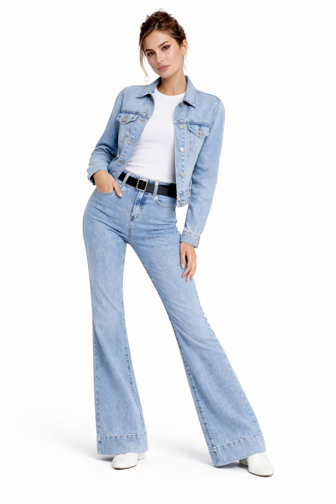 Ψηλόμεσο τζιν παντελόνι καμπάνα που συνδυάζει διαχρονική αισθητική και άνετη εφαρμογή, δημιουργώντας μια κομψή και θηλυκή σιλουέτα. Η εφαρμογή αγκαλιάζει τη μέση και τους γοφούς, ενώ ανοίγει σταδιακά προς το τελείωμα, χαρίζοντας ισορροπία και κίνηση σε κάθε βήμα. Το ύφασμα προσφέρει σταθερότητα με την απαραίτητη ελαστικότητα, ώστε να εφαρμόζει όμορφα χωρίς να περιορίζει την κίνηση, κάνοντάς το ιδανικό για πολύωρη χρήση μέσα στη μέρα.