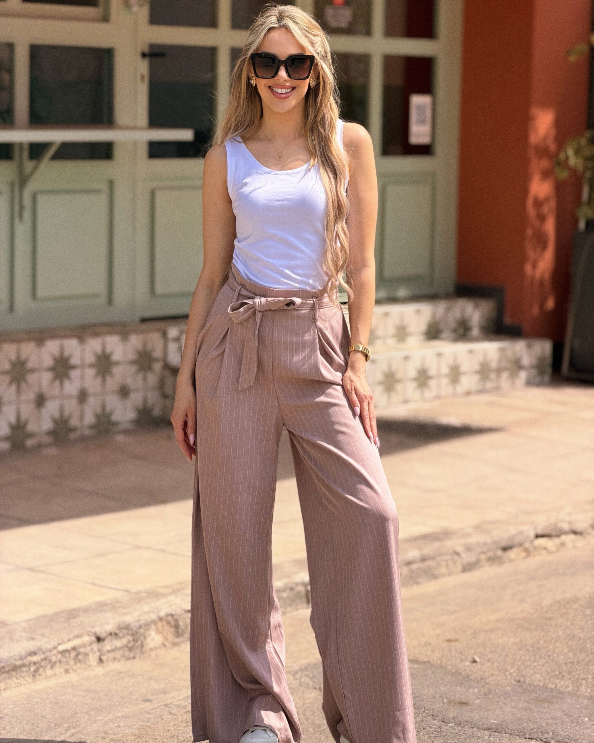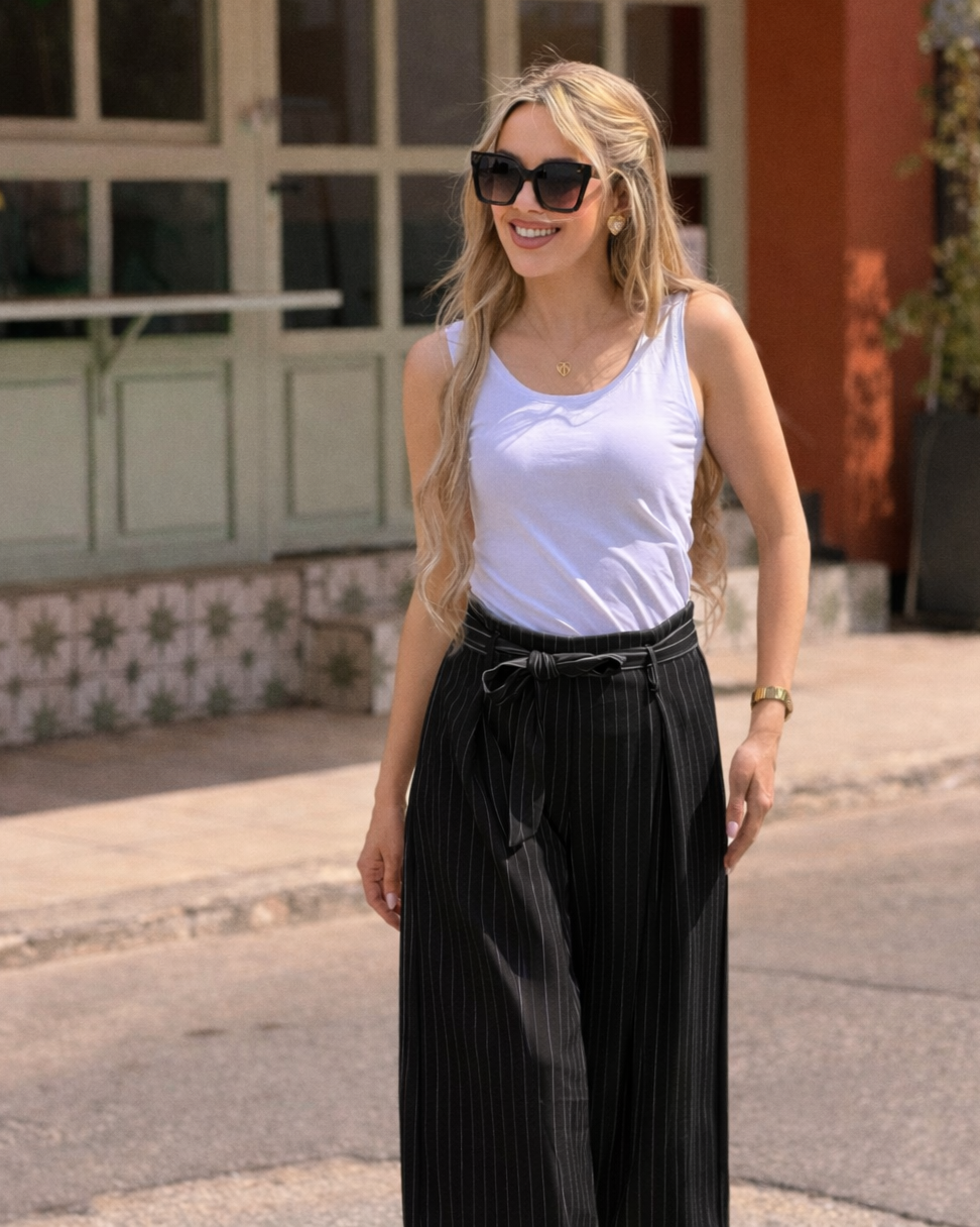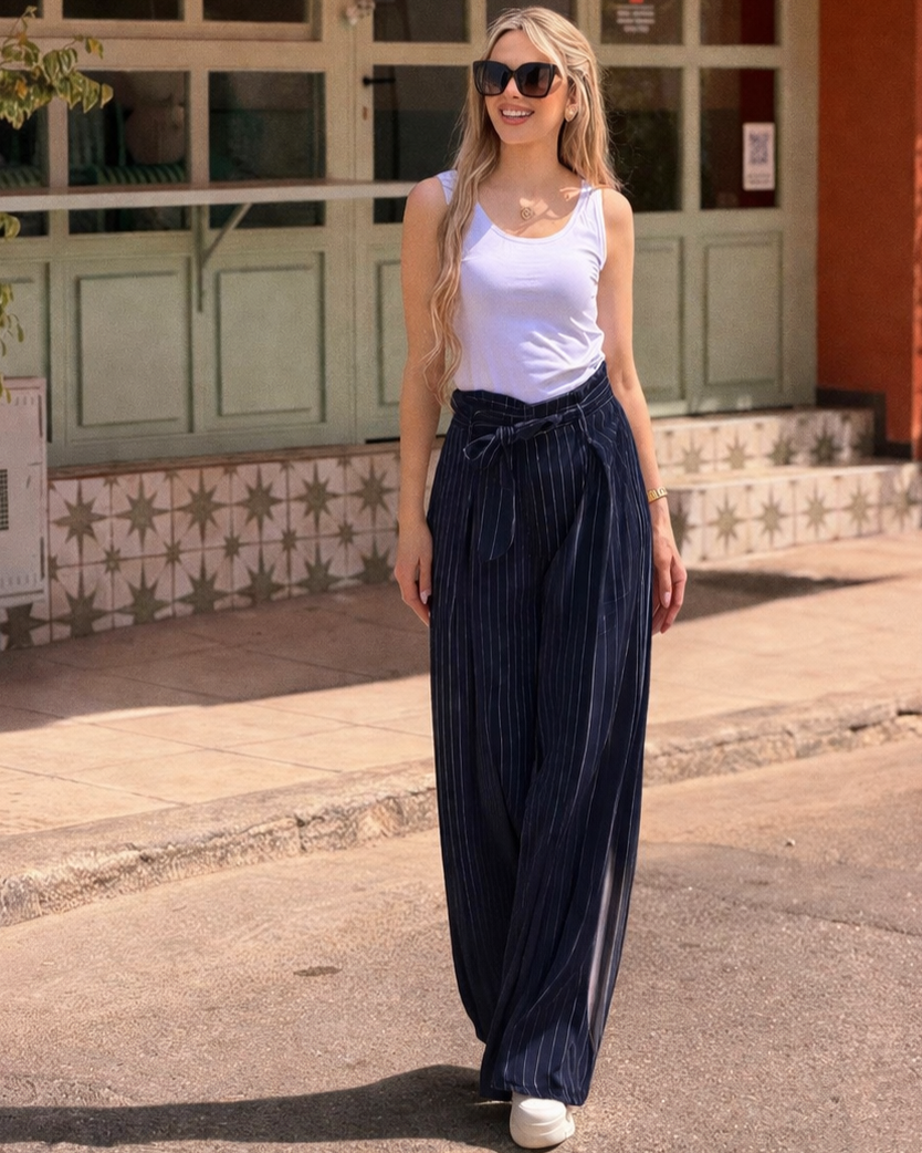 Εντυπωσιακό παντελόνι με κάθετη ρίγα που επιμηκύνει οπτικά τη σιλουέτα και χαρίζει κομψό και ισορροπημένο αποτέλεσμα σε κάθε εμφάνιση. Η ψηλόμεση γραμμή αγκαλιάζει όμορφα τη μέση, ενώ η υφασμάτινη ζώνη που δένει μπροστά προσθέτει θηλυκή λεπτομέρεια και επιτρέπει καλύτερη προσαρμογή στο σώμα.
