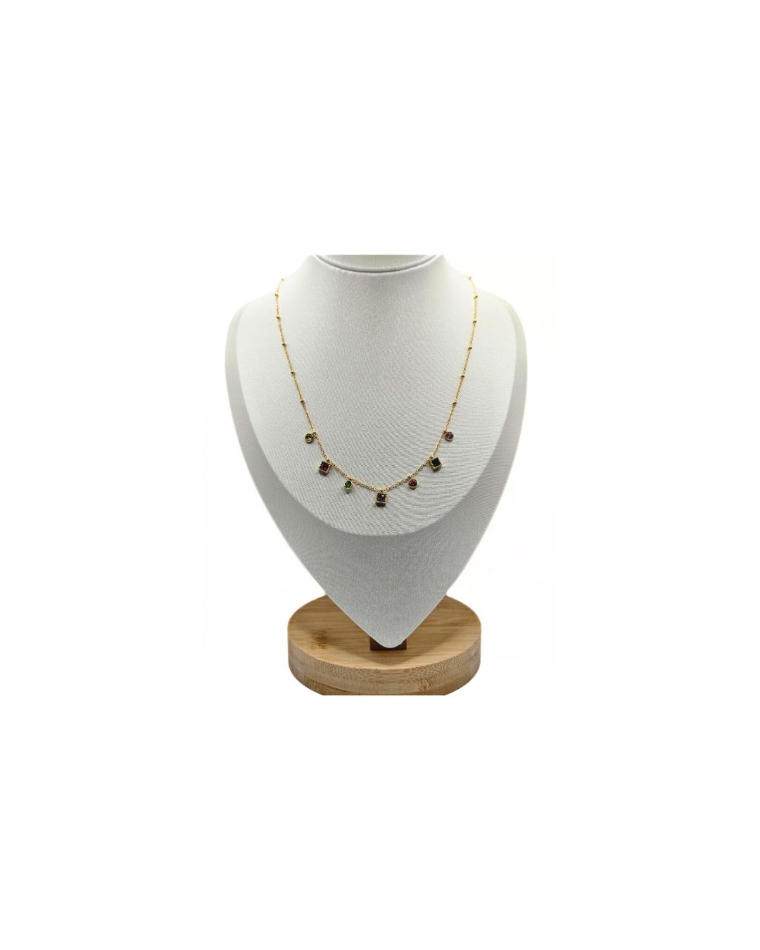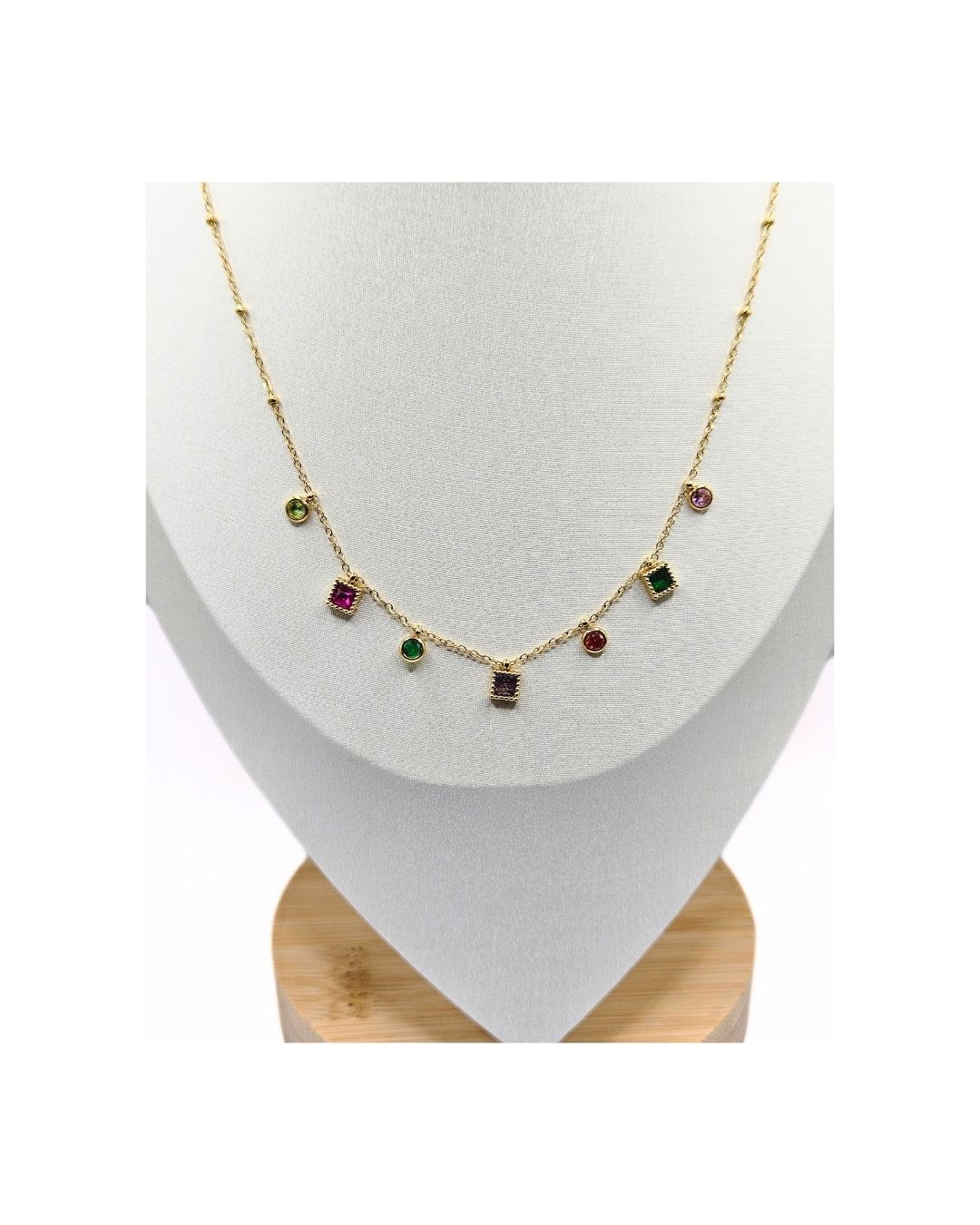 Λεπτό χρυσό αλυσιδάκι στολισμένο με πολύχρωμα τετραγωνάκια και στρογγυλά στοιχεία που προσθέτουν μια παιχνιδιάρικη και ζωντανή νότα στην εμφάνισή σου. Ιδανικό για να δώσεις χρώμα και ενέργεια στο καθημερινό σου στυλ.