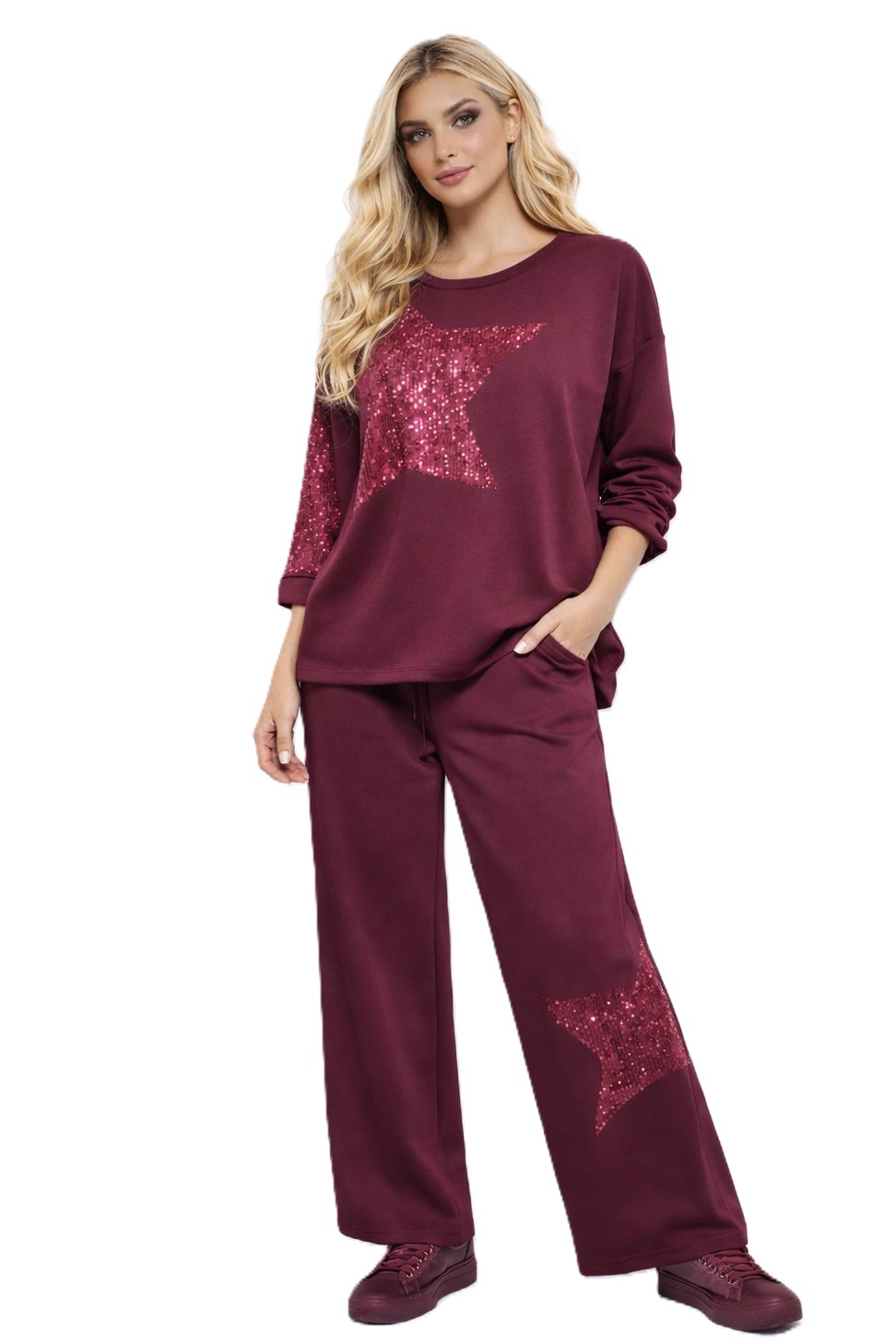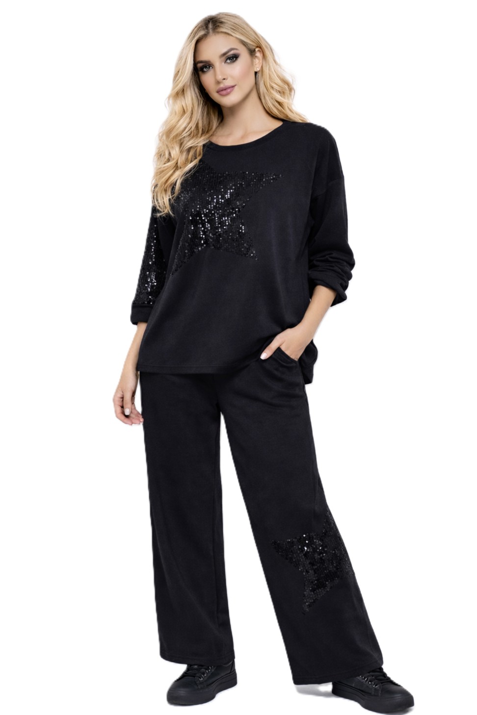 Άνετο και ιδιαίτερο σετ φόρμας που συνδυάζει casual αισθητική με μοντέρνες λεπτομέρειες. Η μπλούζα διαθέτει στρογγυλή λαιμόκοψη και χαλαρή γραμμή, ενώ το εντυπωσιακό αστέρι από παγιέτες στο μπροστινό μέρος προσθέτει λάμψη και ξεχωριστό χαρακτήρα. Το παντελόνι ολοκληρώνεται με αντίστοιχη λεπτομέρεια στο πόδι, δημιουργώντας ένα αρμονικό και stylish σύνολο. Το ελαστικό και μαλακό ύφασμα προσφέρει άνεση και ελευθερία κινήσεων, καθιστώντας το ιδανικό για καθημερινές εμφανίσεις από το πρωί έως το βράδυ.