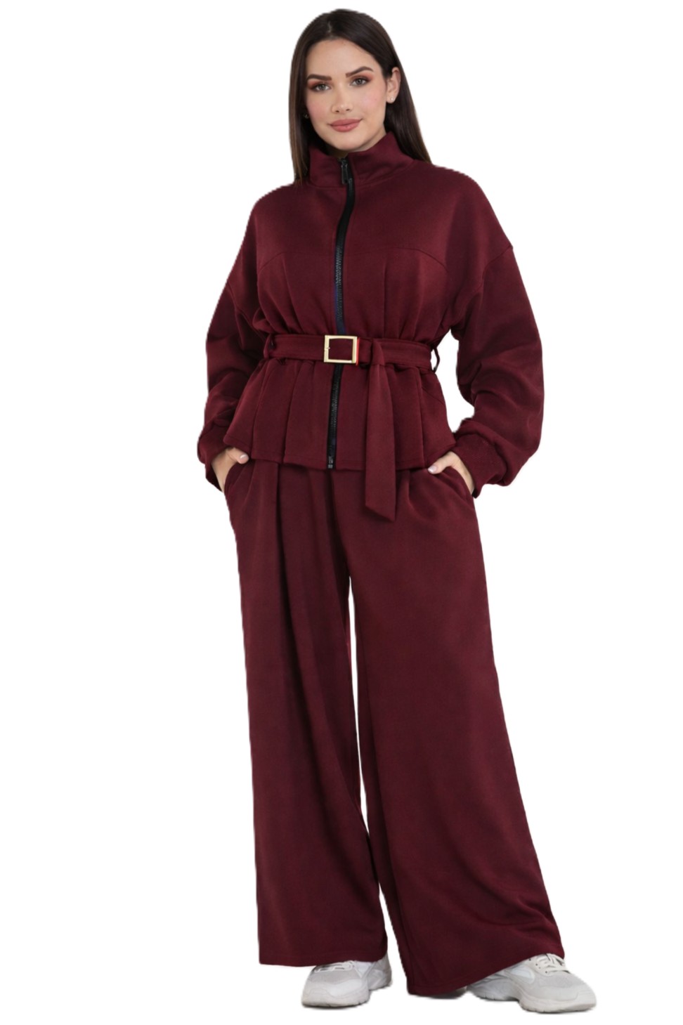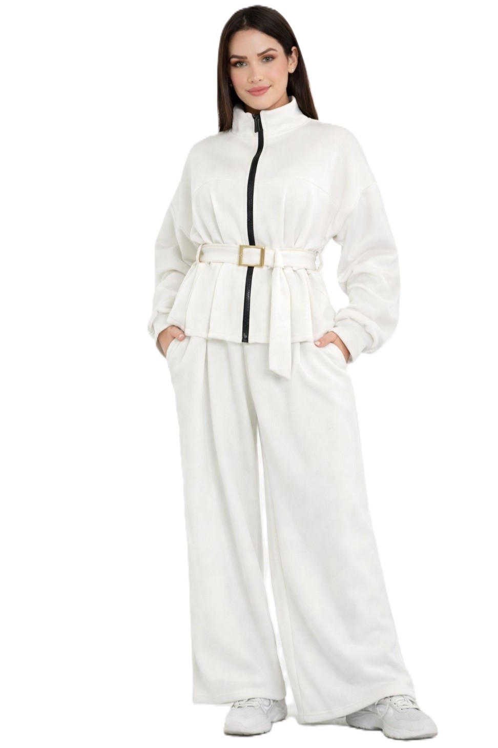 Ιδιαίτερο σετ που συνδυάζει μοντέρνο σχεδιασμό και άνεση, δημιουργώντας ένα κομψό σύνολο για κάθε στιγμή της ημέρας. Η ζακέτα με όρθιο γιακά και κλείσιμο με φερμουάρ διαθέτει ζώνη στη μέση που αναδεικνύει τη σιλουέτα και χαρίζει θηλυκό χαρακτήρα χωρίς να περιορίζει την κίνηση. Το παντελόνι σε φαρδιά γραμμή προσφέρει άνετη εφαρμογή και ελευθερία κινήσεων, ενώ η απαλή υφή του υφάσματος χαρίζει ευχάριστη αίσθηση στο σώμα. Ένα σετ που φοριέται εύκολα από το πρωί έως το βράδυ και προσαρμόζεται ιδανικά τόσο σε καθημερινά όσο και σε πιο προσεγμένα looks.