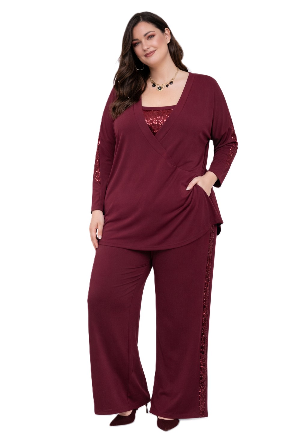 Εντυπωσιακό σετ τριών τεμαχίων που συνδυάζει κομψότητα, άνεση και θηλυκή αισθητική, ιδανικό για γυναίκες που θέλουν να ξεχωρίζουν σε κάθε περίσταση. Η μπλούζα διαθέτει σταυρωτό ντεκολτέ που κολακεύει το μπούστο και δημιουργεί elegant γραμμή, ενώ το μπουστάκι που φοριέται εσωτερικά προσφέρει σταθερότητα και άνετη κάλυψη. Το παντελόνι έχει χαλαρή εφαρμογή και διακοσμητική λωρίδα παγιέτας στο πλάι, προσθέτοντας διακριτική λάμψη και επιμηκύνοντας οπτικά τη σιλουέτα. Το σετ φοριέται άψογα ως ολοκληρωμένο σύνολο για πιο ιδιαίτερες εμφανίσεις, αλλά και ξεχωριστά, δημιουργώντας πολλούς διαφορετικούς συνδυασμούς μέσα στην ημέρα.