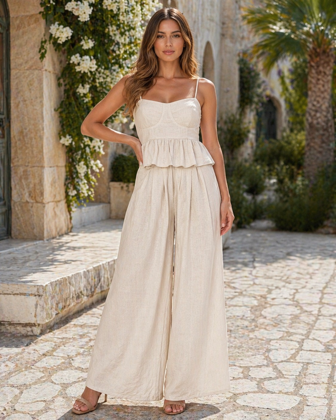 Το κομψό σετ Elira αποτελείται από τοπ με τιράντες και βολάν στο τελείωμα και παντελόνα σε φαρδιά γραμμή. Το τοπ εφαρμόζει στο στήθος και αναδεικνύει το μπούστο, ενώ η παντελόνα προσφέρει άνεση και ελευθερία κινήσεων. Ιδανική επιλογή για καλοκαιρινές εμφανίσεις από το πρωί έως το βράδυ.