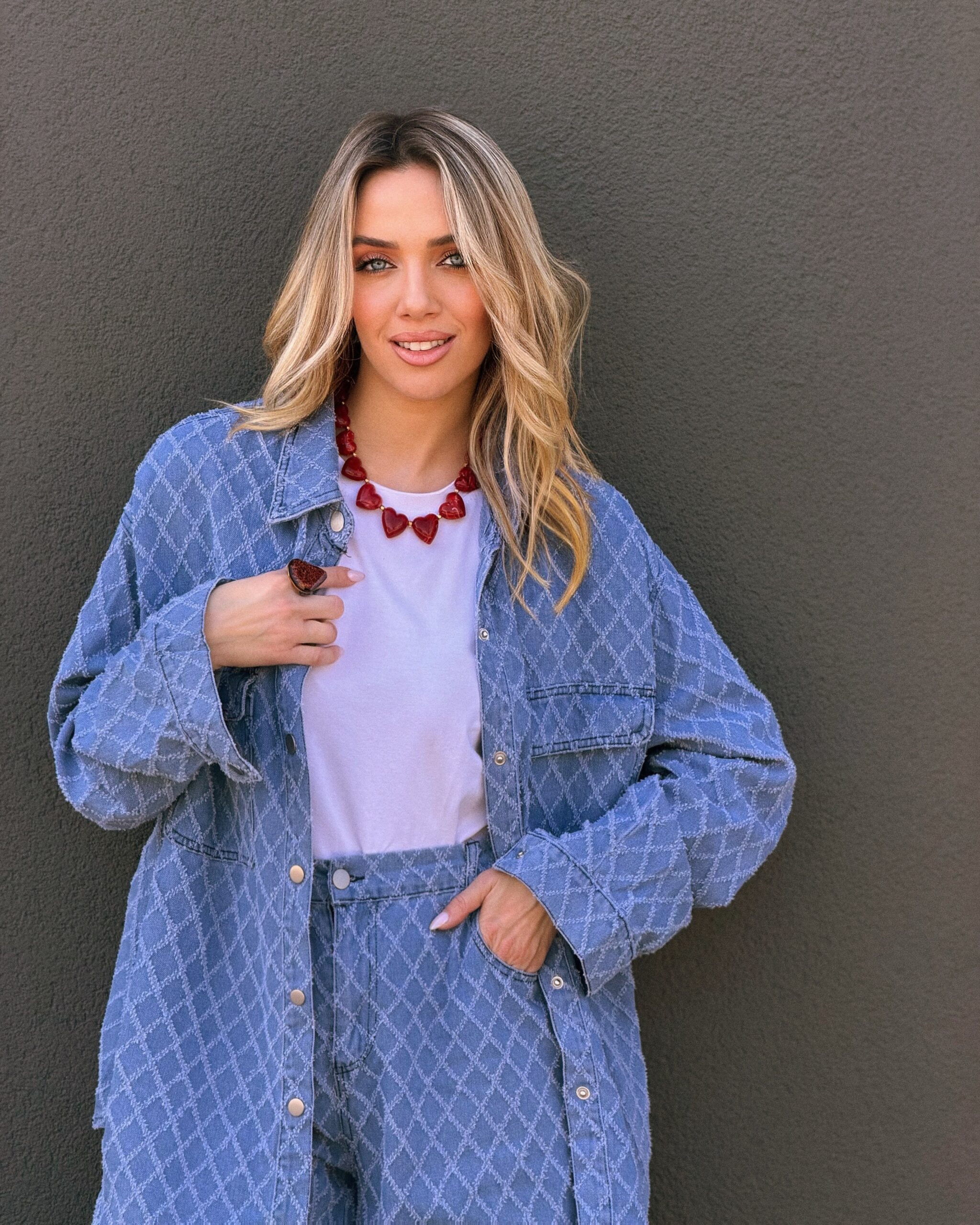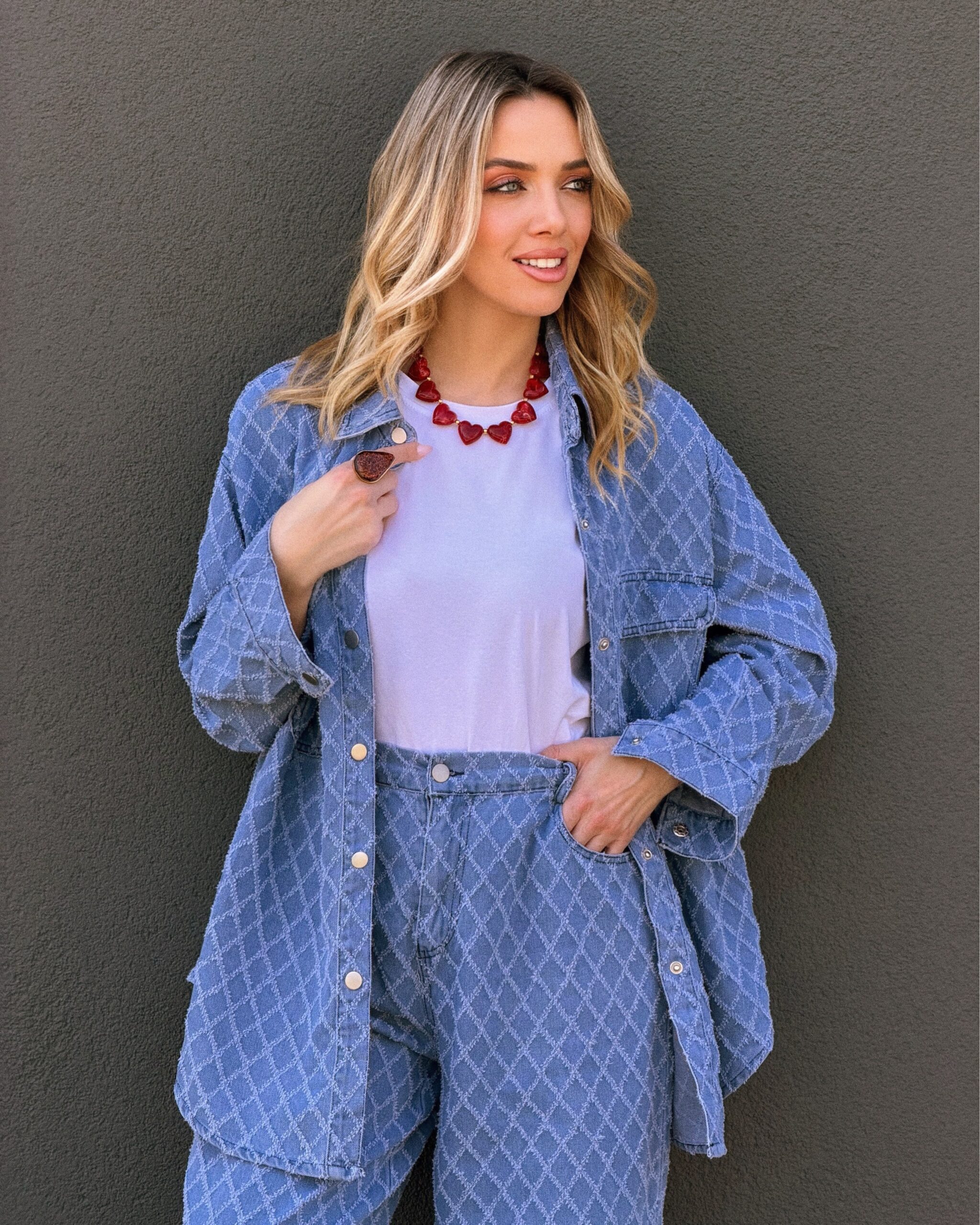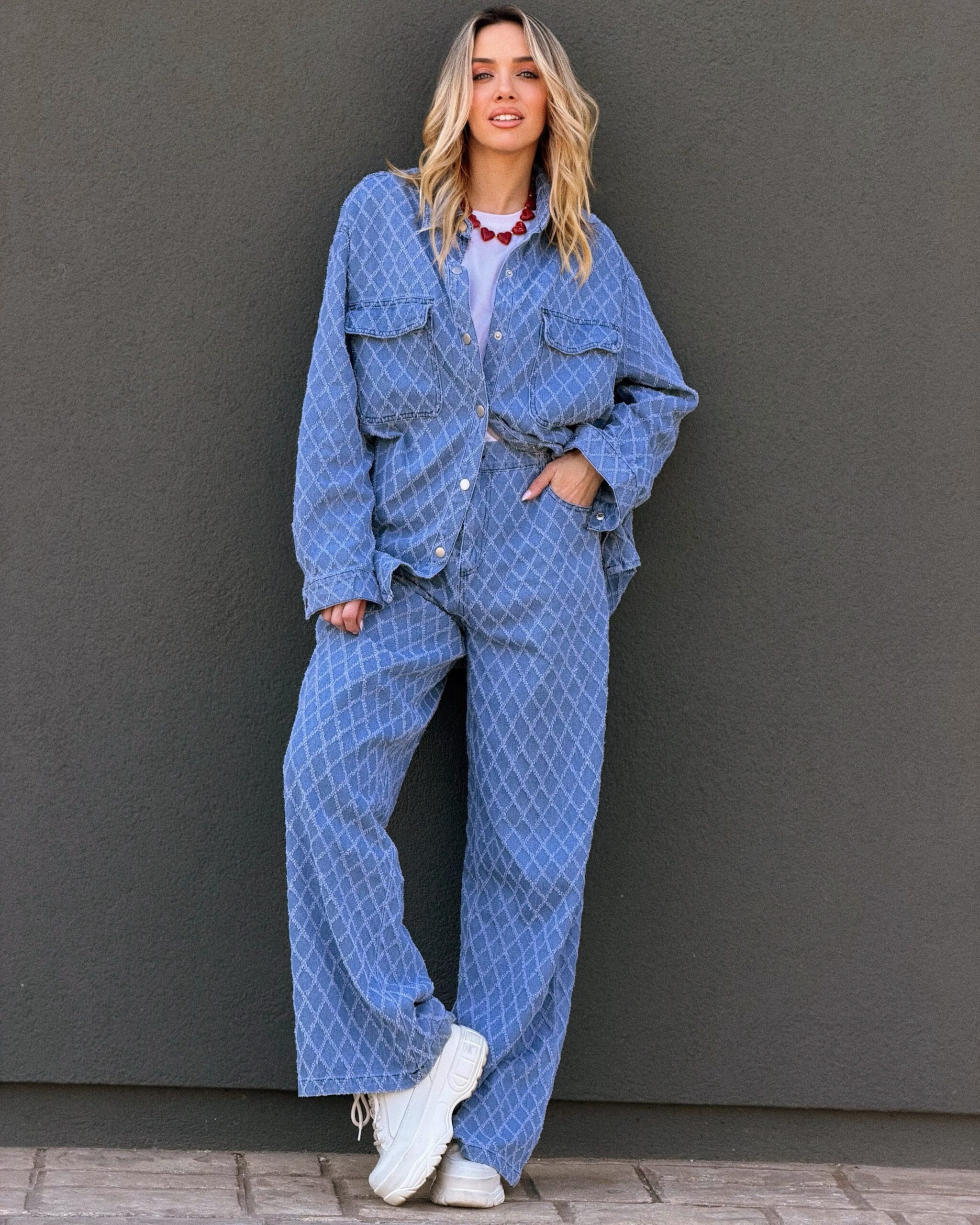 Το Σετ Τζιν με Γεωμετρικό Σχέδιο συνδυάζει άνεση και μοντέρνο ύφος σε ένα ολοκληρωμένο denim σύνολο. Το πουκάμισο διαθέτει γιακά, κουμπιά μπροστά και τσέπες στο στήθος, με χαλαρή γραμμή που προσφέρει άνετη εφαρμογή και κολακεύει το σώμα. Το παντελόνι έχει ίσια, άνετη γραμμή και σταθερή μέση, χαρίζοντας ισορροπημένη σιλουέτα και ελευθερία κινήσεων. Το διακριτικό γεωμετρικό σχέδιο δίνει μια ξεχωριστή πινελιά στο κλασικό τζιν, καθιστώντας το ιδανικό για καθημερινές αλλά και πιο προσεγμένες εμφανίσεις. Φοριέται εύκολα ως σετ, αλλά και ξεχωριστά για περισσότερους συνδυασμούς μέσα στη γκαρνταρόμπα σου.